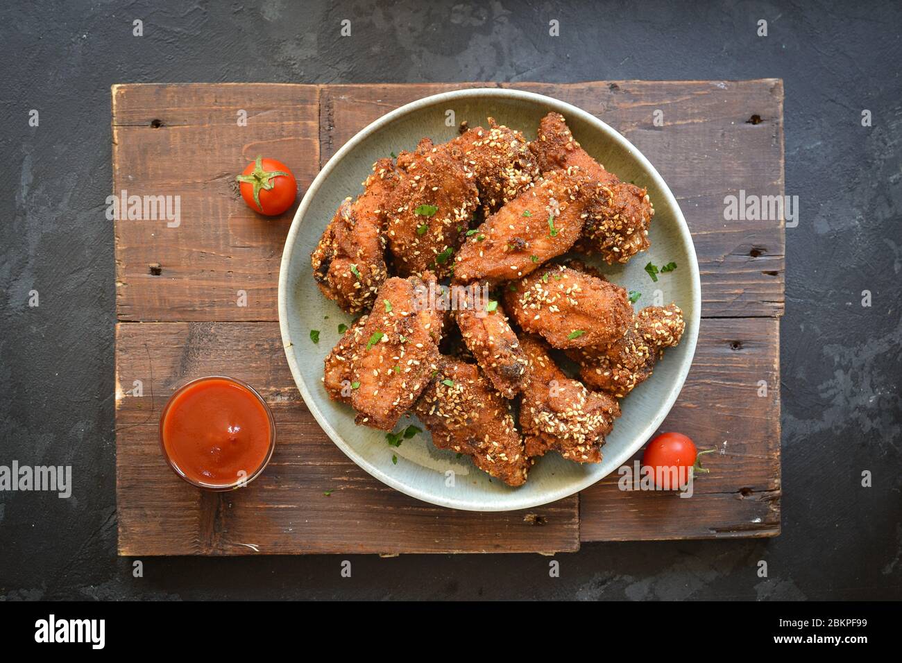 Gebratene hühnerflügel in barbecue-sauce und gemischtem gemüsesalat mit pfeffersamen rosmarin salz in schwarzer steinplatte auf grauem steintisch. Im Ofen gebratene Pouletflügeli. Gebratene Flügel in einer Pfanne oder im Ofen gebacken.